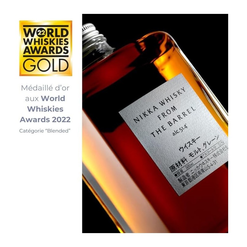 Élaboré à partir des single malts de Yoichi et Miyagikyo et d’un whisky de grain unique, Nikka From the Barrel incarne l’audace et l’excellence du whisky japonais. Son nom fait référence à son embouteillage sans réduction après assemblage, directement « from the barrel ». Ce blend complexe et intense est reconnu mondialement pour sa structure équilibrée et sa richesse aromatique. Il a remporté de nombreuses récompenses dont la Médaille d’Or aux World Whiskies Awards à plusieurs reprises.